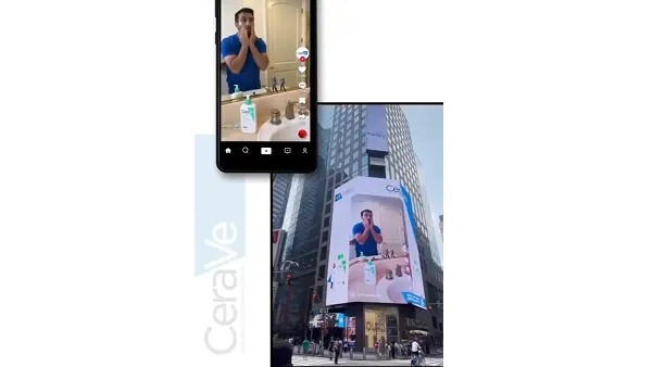 Billboard: Amplifies existing TikTok campaigns onto large-scale urban displays. Skincare brand CeraVe notably extended its #CleanseLikeaDerm campaign to Times Square billboards, merging user-generated content (UGC) with high-impact visibility.